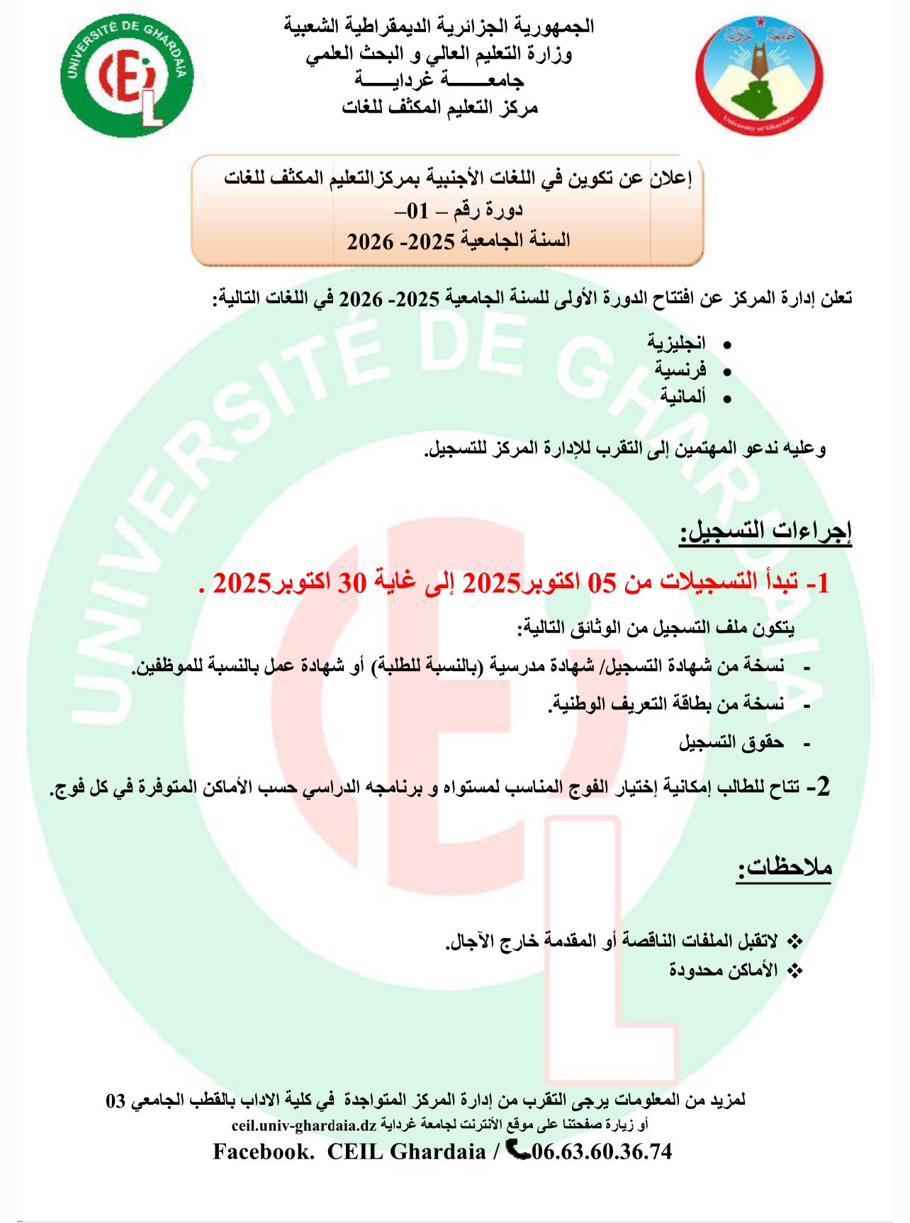يعلن المركز المكثف للغات بجامعة غرداية عن بداية التسجيلات بالقطب رقم 3 بكلية الأداب واللغات الأجنبية